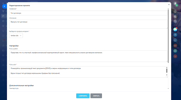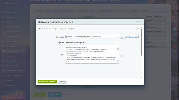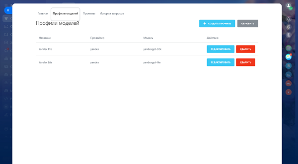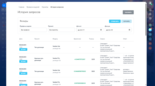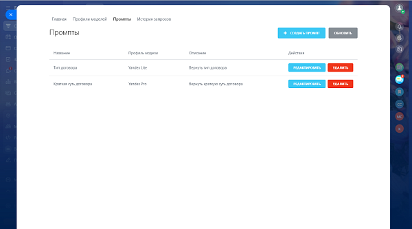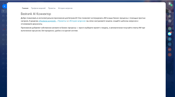 - Доступ к настройке профилей моделей, шаблонов промптов и просмотру истории запросов имеют только администраторы Битрикс24.