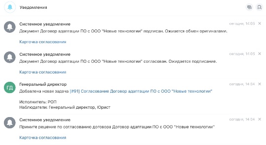 Решение отправляет уведомления о необходимости согласования и напоминания о просроченных сроках, что поможет сократить время согласования и избежать пропуска важных этапов.